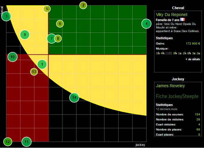 Pour résumer : plus il y a de vert, meilleur est le cheval, et plus il y a de bleu, meilleur est le jockey. Moins il y a de rouge, meilleures sont les chances du cheval à l’arrivée.